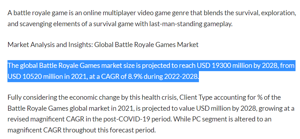 The BR market is huge with Apex legends having 138,000 concurrent players, Fortnite has 350 million registered players, and Warzone had 60 million registered players in 2020.