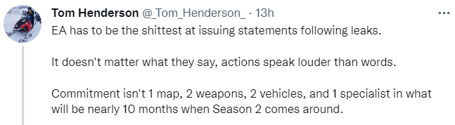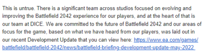 Tom Henderson over on twitter reports on rumours that Dice have pulled the plug on active development, cutting their losses, and moving 2042 into a maintenance mode. Presumably, they will fix bugs and add small levels of content, but the bulk of their staff are working on other things.