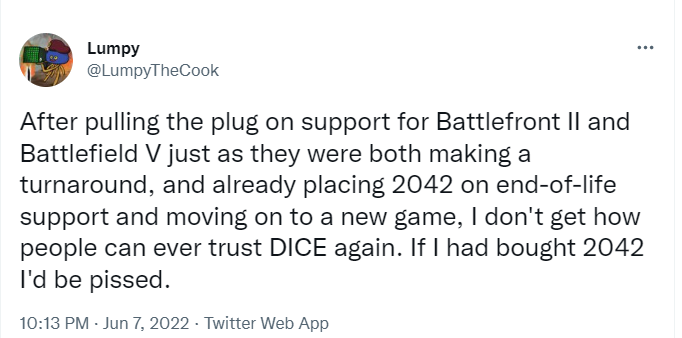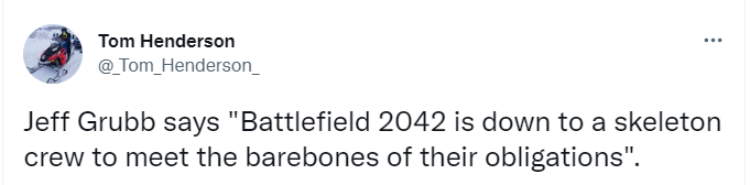 Tom Henderson over on twitter reports on rumours that Dice have pulled the plug on active development, cutting their losses, and moving 2042 into a maintenance mode. Presumably, they will fix bugs and add small levels of content, but the bulk of their staff are working on other things.