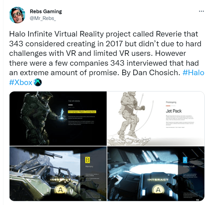 The first is the news, from Mr Rebs on twitter that 343 cancelled a Halo Infinite VR game in 2017 called “Reverie”. He provided some nice concept art and an explanation of why development was halted.
