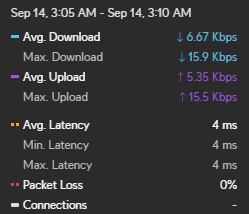 - Throughput, latency, download, and upload stats