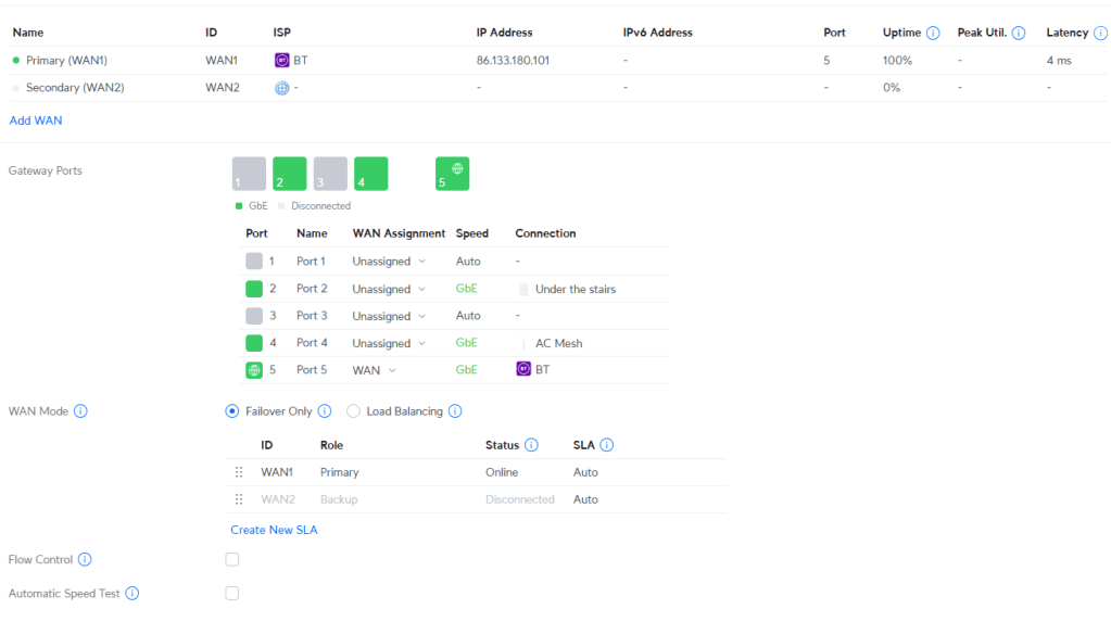 Within a minute or two the UniFi gateway was online, and I was seeing a proper BT public IP address in the dashboard.